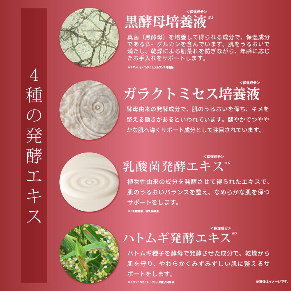 (保湿成分:※4 黒酵母培養液/※5 ガラクトミセス培養液/※6 乳酸菌発酵エキス/※7 ハトムギ発酵エキスなど)
