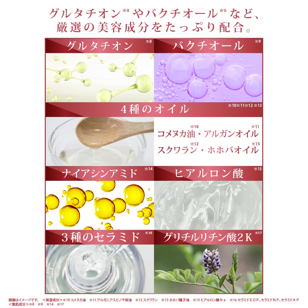 *1 年齢に応じた肌のお手入れ <保湿成分>※1 DNA-Na ※2 加水分解エラスチン ※3 加水分解コラーゲン、水溶性コラーゲン、サクシノイルアテロコラーゲン ※4 アウレオバシジウムプルランス培養物 ※5 ※6 乳酸桿菌/豆乳発酵液 ※7 サッカロミセス/ハトムギ種子発酵液 ※9 コメヌカ油、アルガニアスピノサ核油、スクワラン、ホホバ種子油 <整肌成分>※8 ※9