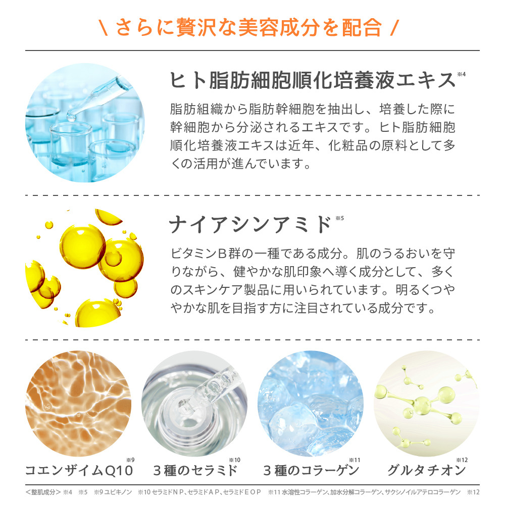 (<整肌成分>ヒト脂肪細胞順化培養液エキス、ナイアシンアミド、コエンザイムQ10※4など)
