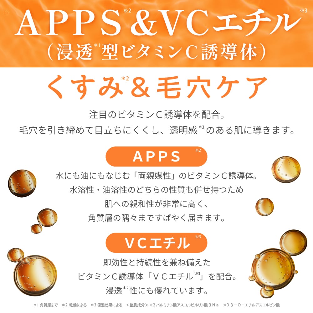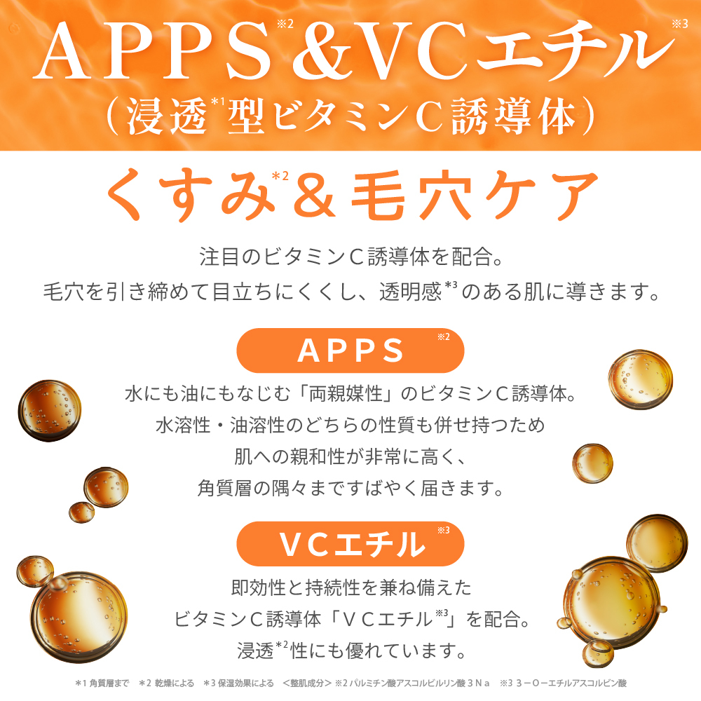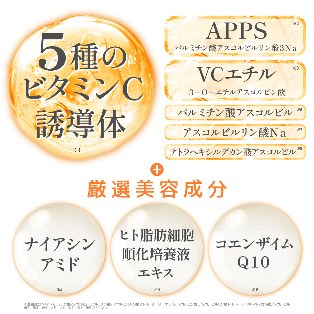 注目のAPPS※2&VCエチル※3(浸透*2型ビタミンC誘導体)など、5種のビタミンC誘導体※1を贅沢に配合。