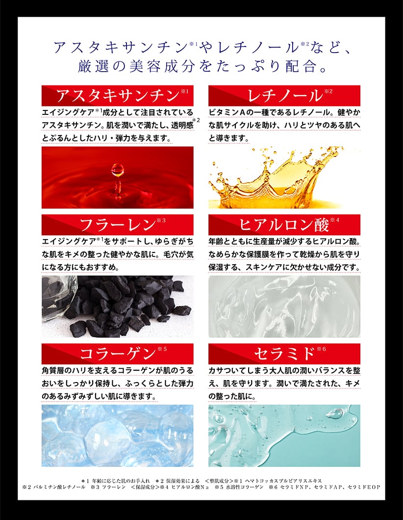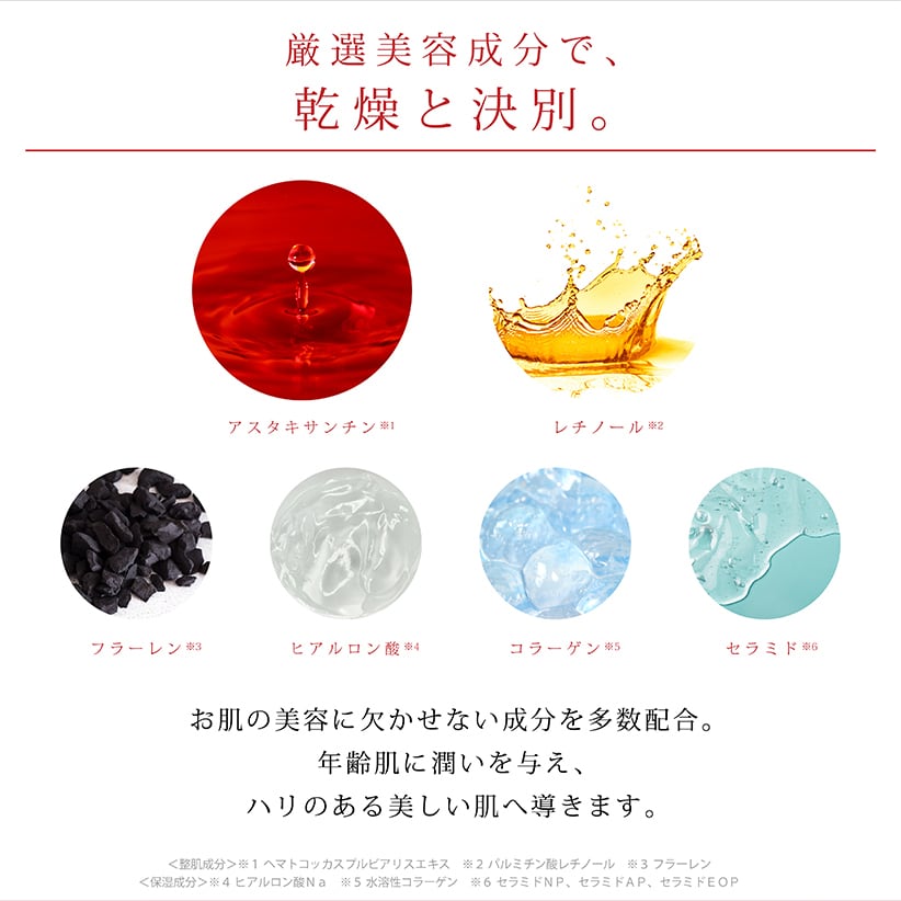 アスタキサンチン、レチノールなど、厳選の美容成分をたっぷり配合。